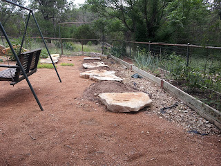 We've made more progress on the back yard. See that stone connecting the "sidewalk" to the bed...well, that's not staying...it was just a temporary measure to keep that area from washing away. Washing away you are saying...yes, we've had more rain. Yeah!!!